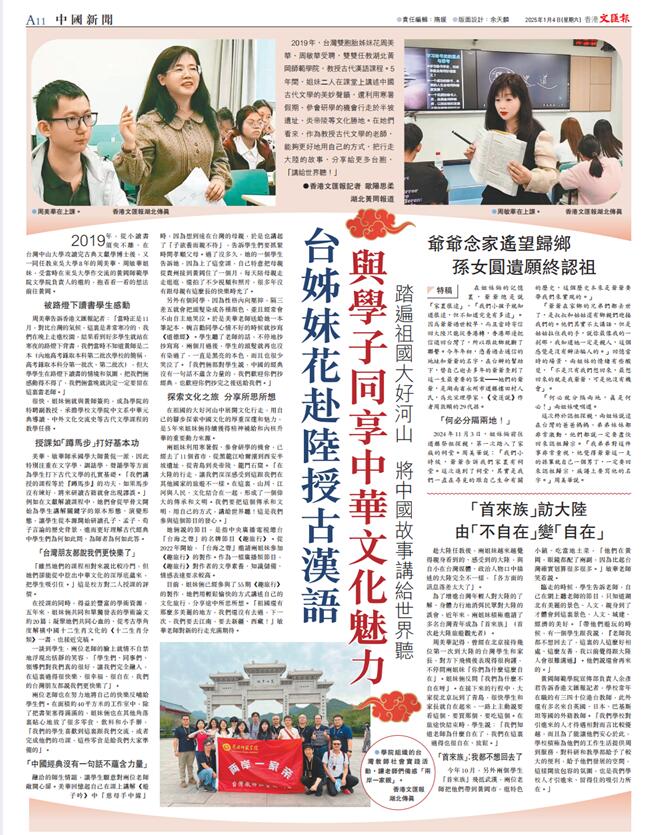 《香港文汇报》2025年1月4日A11版(中国新闻)以《台姊妹花赴陆授古汉语 与学子同享中华文化魅力》为题,专版报道了我校台湾籍教师周美华、周敏华双胞胎姐妹作为教授古代汉语课程的教师,在祖国的大好河山中探索文化之旅,通过网络平台分享文旅见闻,积极传扬中国传统文化,将中国故事讲给世界听。