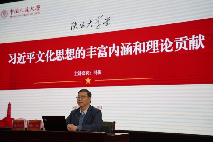 冯俊教授的讲座围绕习近平文化思想的正式提出、习近平文化思想是建设和发展中国特色社会主义文化的根本遵循、“第二个结合”是又一次的思想解放、习近平文化思想是破解“古今中西之争”的钥匙、文艺观是习近平文化思想中的精彩篇章、“七个着力”是建设文化强国的实践要求和行动纲领、不断丰富拓展习近平文化思想的体系化、学理化的研究和阐释等论题全面展开。冯俊教授认为,习近平文化思想是习近平新时代中国特色社会主义思想的“文化篇”,内涵十分丰富、论述极为深刻,是新时代党领导文化建设实践经验的理论总结,丰富和发展了马克思主义文化理论,是继续推动文化繁荣、建设文化强国的根本遵循和行动指南。深入学习贯彻习近平文化思想,我们要坚守中国共产党的文化领导权,巩固中华民族的文化主体性,不断丰富拓展习近平文化思想的体系化、学理化的研究和阐释,加强中国特色哲学社会科学的学科体系、学术体系、话语体系的建设,构建中国哲学社会科学自主知识体系。