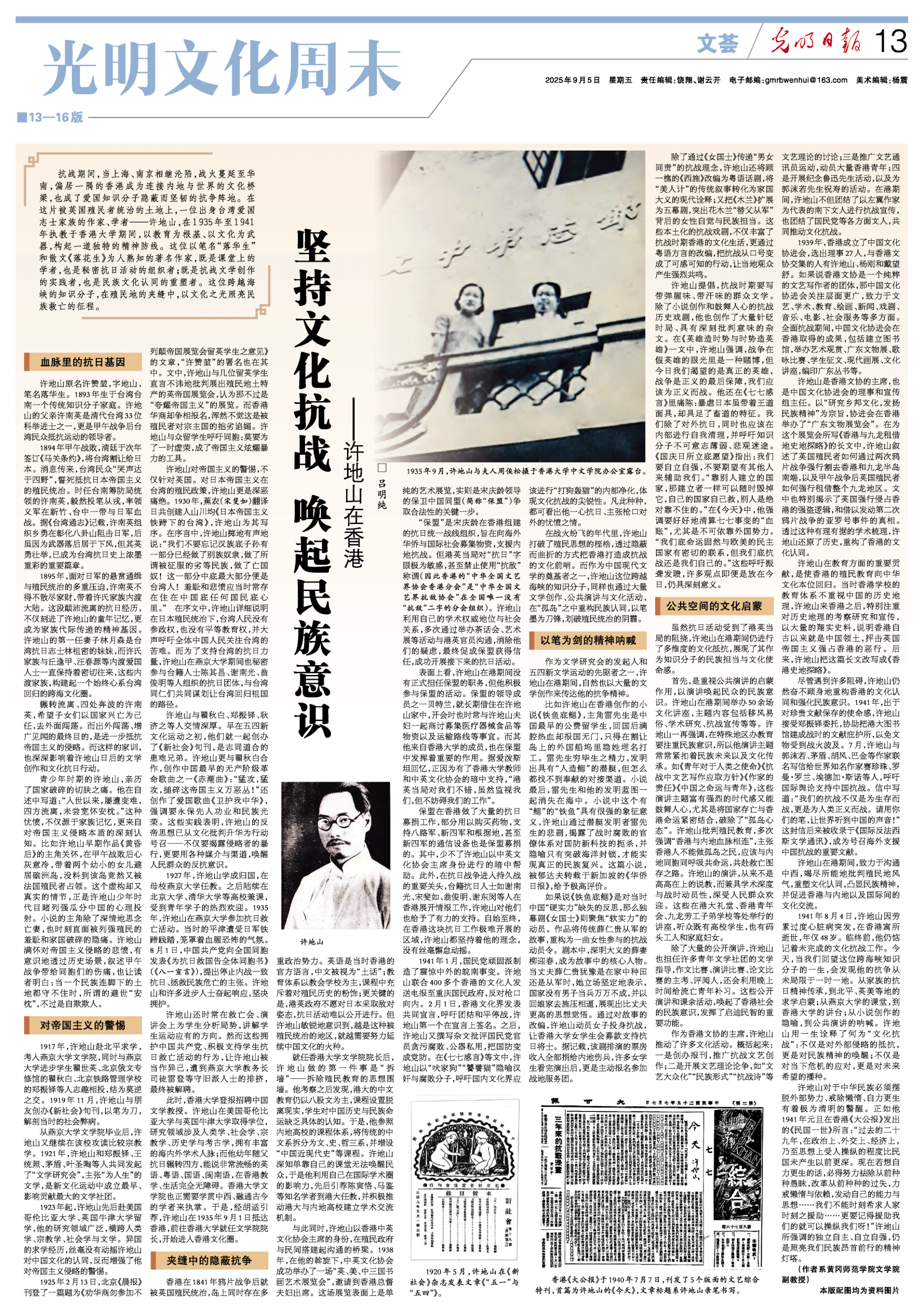 光明日报:坚持文化抗战 唤起民族意识 ——许地山在香港